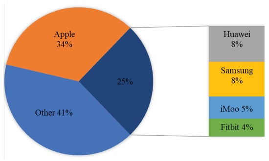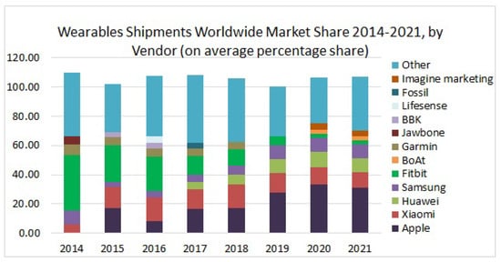 - Laricchia, F. Wearables Shipments Worldwide Market Share 2014–2021, by Vendor, 2022. Online, Business Report. Available online: https://www.statista.com/statistics/435944/quarterly-wearables-shipments-worldwide-market-share-by-vendor/ (accessed on 26 April 2022).