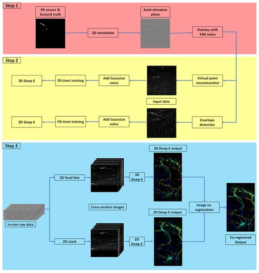 - Zhang, H.; Bo, W.; Wang, D.; Di Spirito, A.; Huang, C.; Nyayapathi, N.; Zheng, E.; Vu, T.; Gong, Y.; Yao, J. Deep-E: A Fully-Dense Neural Network for Improving the Elevation Resolution in Linear-array-based Photoacoustic Tomography. IEEE Trans. Med. Imaging 2021, 41, 1279–1288. [Google Scholar] [CrossRef] [PubMed]