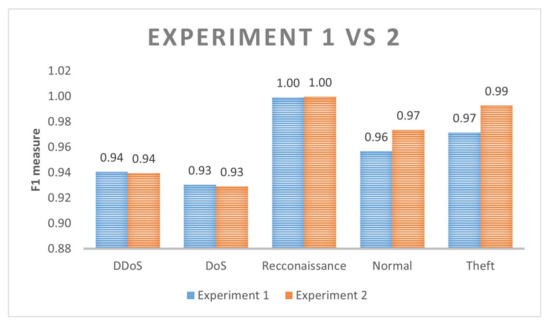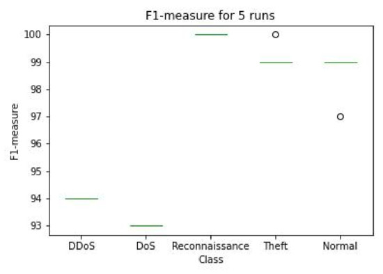We compare the best model obtained in the present paper with other related work in Table 2. As we can see references [5,6,15,17] use the shorter version of the dataset; thus, the F1-score to detect DoS and DDoS outperforms our approach because the quantity of datasamples is much less; thus, the classifiers can determine better boundaries. However, our methodology can detect Theft attacks better than all the other related work as shown in Table 2. In addition, our approach can detect Normal datasamples better than other approaches except [5] with only 2% difference. As we described before that comparing the accuracy of our approach with papers that use the shorter version of the BoT-IoT dataset is not fair since the shorter version does not contain enough statistic characteristics that represent the population.