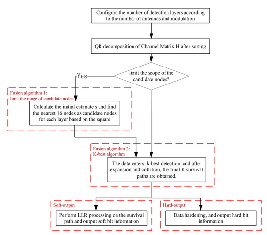 - Liu, Y.-X.; Dai, Y.-X.; Ueng, Y.-L. Post-Processing of K-best MIMO Detection for High-Order Modulations. In Proceedings of the 2021 IEEE Asia Pacific Conference on Circuit and Systems (APCCAS), Penang, Malaysia, 22–26 November 2021; p. 1. [Google Scholar]