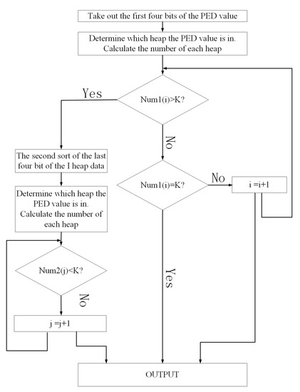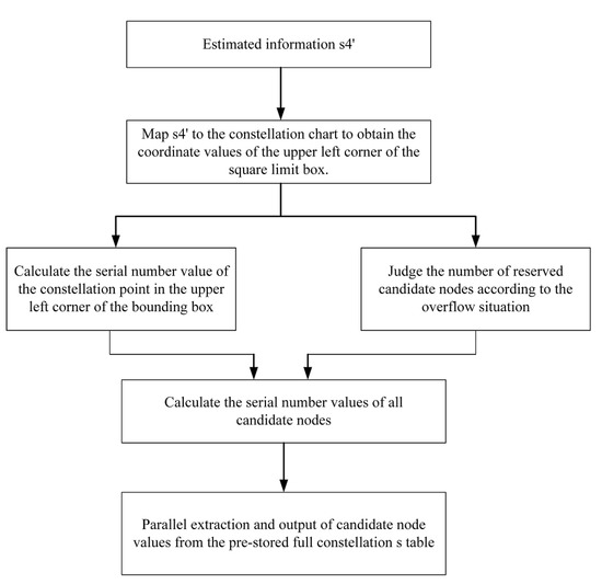 - Sorting: When the PED values of all candidate child nodes in a layer are calculated, the sorting operation is carried out, and the smallest K nodes are retained as the parents of the next layer’s candidate nodes. If this is not the last layer, then return to step 2.