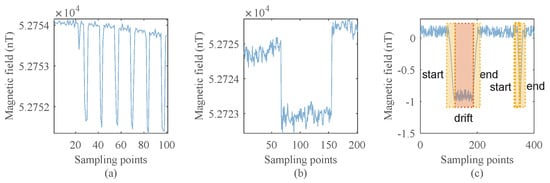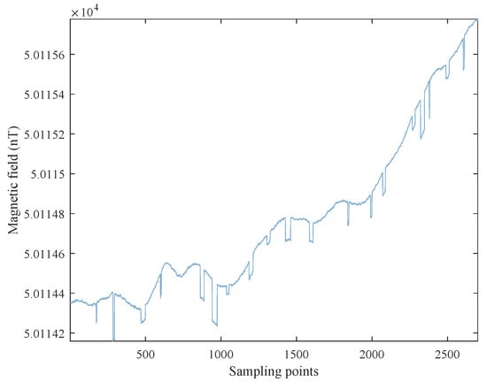 The Earth’s magnetic field has a large magnitude of about 50,000 nT [9] and wide range of variation. The variation comes from the sum of diurnal variations, micropulsations, magnetic storms, and long-term variations [18]. Due to the above influence, the variation in the Earth’s magnetic field is complex, and its variation range can reach several hundred nanoteslas in a period of time [9,19]. However, the magnitude of OBE interference is very small. For example, a beacon light can only cause magnetic interference of about 0.25 nT, which is far less than the variation of the Earth’s magnetic field. Therefore, the large variations of the Earth’s magnetic field should be reduced.