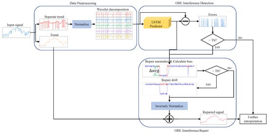 Based on the above analysis, we propose an unsupervised automatic OBE interference compensation framework, as shown in Figure 2. First, the magnetic field data is detrended, normalized, and decomposed using a wavelet. These procedures are collectively called preprocessing. Then we use the LSTM network to model and predict the magnetic field data and detect interferences by comparing the errors between the prediction and the input with an adaptive threshold based on extreme value theory (EVT). With the detection results, we repair the interference anomalies with the predictions and then repair the data drift with calculated bias. Finally, the repaired results are superimposed with the magnetic field trend to obtain the final compensated results.