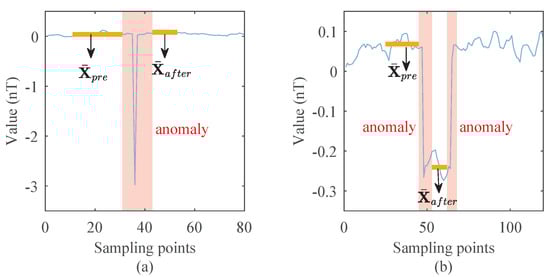 The mode of OBE interference includes not only spike-like short-term interference but also drift-like long-term interference. The detection results of these two types of OBE interference are shown in Figure 4. The parts where the OBE interference appears and disappears are detected and marked with red backgrounds. These parts (named anomalies) should be corrected. In addition, notice that if the OBE interference is long-term, there is a data drift in the magnetic field, which should also be corrected.