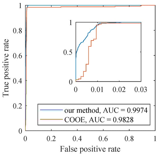 We also compare the ROC curves and calculate the AUCs of the two methods, as shown in Figure 6. The ROCs and AUCs were calculated by counting all detection results from S-1 to S-10. Our method achieves a higher AUC value, which is close to 1, indicating that our method can detect anomalies more accurately.