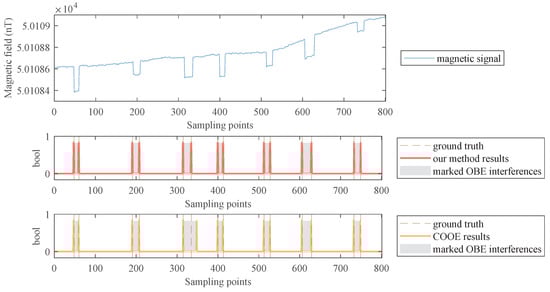 Figure 7 shows the detection results of a segment of semi-real data. We can find that our method can detect the OBE interference well, almost consistent with the ground truth. The COOE method can also detect all the OBE interferences, but there are some offset points for some OBE interferences. This phenomenon is caused by the fixed-length and non-overlapping sliding window used in COOE. As a note, the fixed window length is hard to pick.