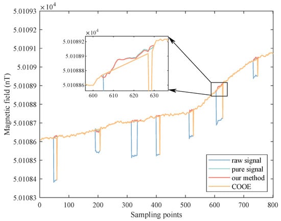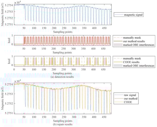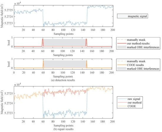 Figure 10a shows the detection results of the aircraft’s radio interference, both methods can detect the interference. Figure 10b shows the repair results of the radio interference. Because the COOE method uses the linear interpolation method to repair, its result completely loses the data characteristics of the magnetic field. Our method can retain the characteristics of the magnetic field data.