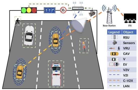 Connected and automated vehicle (CAV) specifically refers to a new generation of vehicles equipped with on board unit (OBU), LiDAR and other sensors, controllers, actuators, and other devices to achieve information exchange and share between vehicles and people, roads, and backstage, which can eventually replace human operation, as shown in Figure 1. With the development of perception technology [1,2,3], decision control technology [4,5,6], and vehicle to everything (V2X) [7,8,9] communication technology, the impact of CAV [10,11,12,13] in people’s daily lives is becoming more and more widespread.