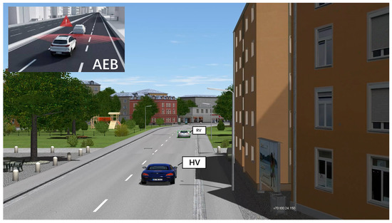 A functional scenario for an automated driving simulation test project is produced by an abstract language description. In the conceptual stage, functional scenarios may be utilized to define an autonomous driving simulation test project and analyze project risks and hazards. Using linguistic scenario notation, functional scenarios define the domain’s entities and their connections. A consistent vocabulary with names for the various things and the connections between these items must be defined due to the utilization of linguistic descriptions. Before testing, the tester needs to confirm the list of test functions and make a list of functional scenarios. One of the more critical features examined in the automatic driving functional test is Autonomous Emergency Braking (AEB). The AEB functioning scenario is as follows: when the host vehicle (HV) senses a potential accident, the car immediately brakes, assuring the driver’s safety. When the HV is moving in a straight line and the safety distance from the remote vehicle (RV) is short, the AEB feature is activated, as shown in Figure 3.