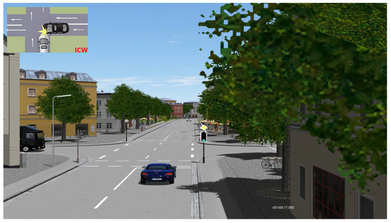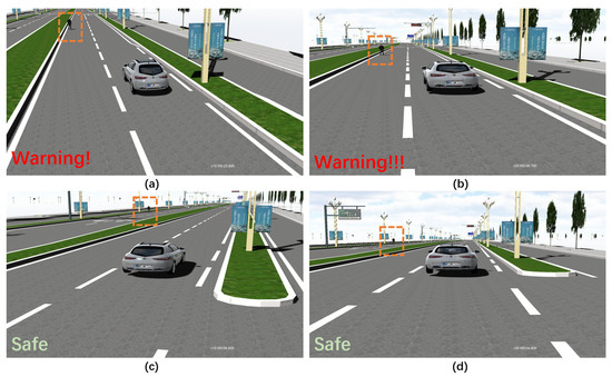 VRUCW test in VTD simulator: (a) case 1: Gap = 5 m, HV’s speed = 10 km/h; (b) case 2: Gap = 5 m, HV’s speed =30 km/h; (c) case 3: Gap = 12 m, HV’s speed = 10 km/h; (d) case 4: Gap = 12 m, HV’s speed = 30 km/h.