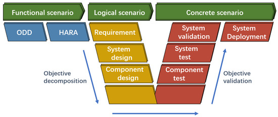 To avoid overlooking many important test scenarios, we systematically review issues based on widely accepted test models (e.g., the V-model) and focus on requirements (for each development phase), examining the methods used to generate scenarios that satisfy those requirements, as shown in Figure 5. Since the testing purposes of different scenarios are different, here is a cut-in scenario as an example. In the functional scenario, it is mainly necessary to specify all the sub-functions, use cases, system architecture, and operational design domain (ODD) under the scenario. The sub-functions of the cut-in function include the vertical control and horizontal control of the vehicle. Test cases can be divided into emergency cut-in, mandatory cut-in, and lane change cut-in according to urgency. The test cases can be divided into close cut-in and long cut-in according to the cut-in distance. The system architecture of the cut-in function includes sensors, controllers, and actuators. The ODD of the cut-in function includes (1) highway or urban expressway, (2) high precision map is valid, and (3) clear lane lines, no road traffic hazard signs, no signal lights, and normal weather.