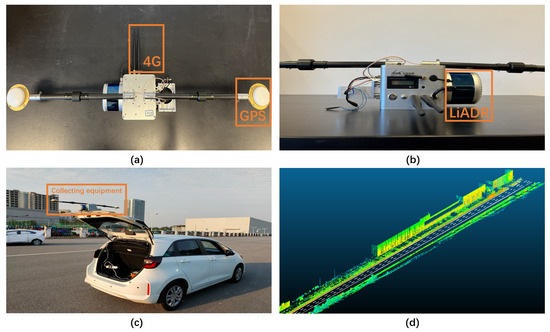 (a) Top view of portable map collecting equipment; (b) main view of portable map collecting equipment; (c) vehicles equipped with collection equipment; (d) collected point cloud image.