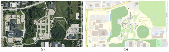 The OpenStreetMap (OSM) [44] project is a knowledge collective that provides user-generated street maps, as shown in Figure 8b. The goal of OSM, which uses the peer production approach that led to the creation of Wikipedia, is to produce a set of map data that is open source, editable, and covered by new copyright laws. The main structure of OSM data is defined by three elements: nodes, ways, and relations. OSM supports exporting .osm map files, which can be converted to OpenDRIVE files (.xodr) by the conversion tool of VTD simulator, or to SUMO-supported map files (.net.xml) by the conversion tool of SUMO.
