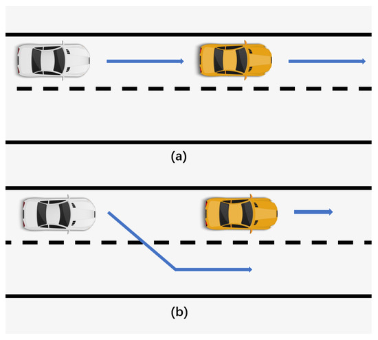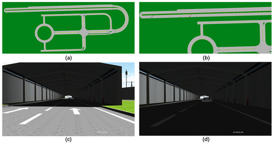 With the descriptions in Section 2 and Section 3, we can obtain the OpenDRIVE map file. Then, placing vehicles in the lanes of the map and setting the behavior, we can obtain the OpenSCENARIO file. The following forward collision warning test is used as the simplest example, as shown in Figure 9a. The remote vehicle (RV) is stationary in the tunnel, and the host vehicle (HV) approaches the RV at a speed of 60 km/h, as shown in Figure 9b. When the distance gets closer, until it is less than the minimum safe distance, the main vehicle will slow down or even change lanes, as shown in Figure 9c,d.
