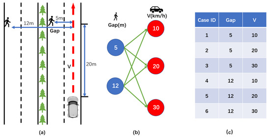 The following will briefly describe how to generalize to generate a Vulnerable Road User Collision Warning (VRUCW) [55] test scenario. Firstly, we need to determine the functional scenario: pedestrians cross the road at different locations with a speed of 1 m/s, the longitudinal distance between the host vehicle and the pedestrians is 20 m, and the host vehicle approaches the pedestrians at a different constant speed to test its warning capability, as shown in Figure 10a. Second, we determine the logical scenario: pedestrian position (5/12) m, host vehicle speed [10/20/30] km/h, as shown in Figure 10b. Third, we generate concrete scenarios and iterate through the combined parameters to obtain a total of six test scenarios, as shown in Figure 10c. Finally, the scenarios are formatted to form OpenSCENARIO files.