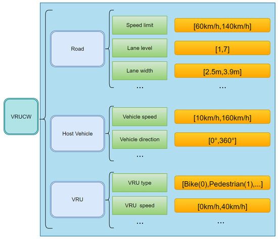 In the subject of autonomous driving, scenario-based autonomous driving simulation testing has been seen as particularly promising. Menzel et al. [19] proposed a three-level hierarchy of “functional-logical-concrete” for scenarios, as shown in Figure 2. Taking the test scenario of a vehicle driving in a straight line as an example, the functional scenario is “vehicle driving straight”, the logical scenario is “vehicle driving straight, speed range is [0, 120] km/h”, the concrete scenario is “vehicle driving straight at 10 km/h”.