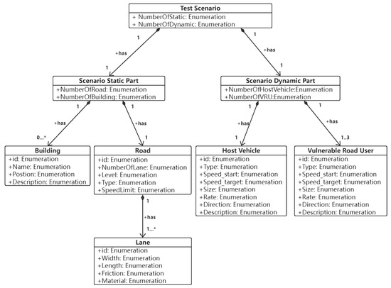 Bagschik et al. [21] proposed a five-layer model of the test scenario in conjunction with the VTD simulator. In the five-layer model, the first layer describes the layout of the road, including markers and topological relationships; the second layer contains the traffic infrastructure; and the third layer is a temporary manipulation of the first two layers. The first three layers constitute the description of the map. The process of format carry-over is to convert the elements of layers one to three into OpenDRIVE [22] syntax format. The fourth layer models objects that are not necessarily part of the transportation infrastructure, such as cars and people; the fifth layer describes environmental influences such as weather. The elements of layers four and five are converted to OpenSCENARIO [23] syntactic format.