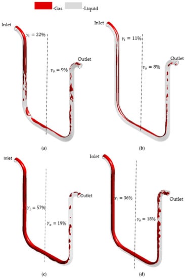 Additionally, the relationship between the gas distribution asymmetry and the mixture flow rate is studied. As demonstrated in Figure 11, the gas asymmetry () grows from 3%, case (b), to 18%, case (a), with the decrease in the flow rate from 149.0 kg/min to 60.8 kg/min at 9% GVF at the CMF200 tube inlet. This is consistent with the simulation results for another pair of the flow rates at GVF at the CMF200 inlet of 16%: the gas asymmetry () equals 38% and 18% for 60.8 kg/min and 100.0 kg/min, respectively, according to the cases (c) and (d) in Figure 11. Hence, the gas distribution asymmetry grows with the decrease in the mixture flow rate. This is due to the fact that the impact of the buoyancy force increases in the case of the low flow rate in comparison with momentum flux. In general, this agrees with a qualitative study by Weinstein [15], which states that the gas accumulation in one side of the triangle-shaped tube might be eliminated by an increase in the mixture flow rate.