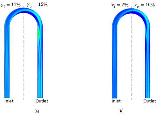 At the same time, the bubbles in CMF200 are too small and the inlet GVF is too low to ensure sufficient buoyancy force to overcome the flow momentum in the inlet vertical part of the CMF200 at 5% inlet GVF. Because of this, the bubbles are distributed almost perfectly following the flow field in CMF200 at 5% GVF, case (c) Figure 13. Because of the separation region in the outlet turn part of the CMF200 tube, the bubbles are slightly accumulated in the outlet part for 5% GVF as demonstrated in case (c) Figure 13. However, since the GVF achieves 8% in case (d) Figure 13, the bubbles’ buoyancy force is able to overcome the momentum in the inlet vertical part of the CFM. Hence, the bubbles aggregate in the inlet part of the CMF200 at 8% GVF, as demonstrated in case (d) Figure 13.