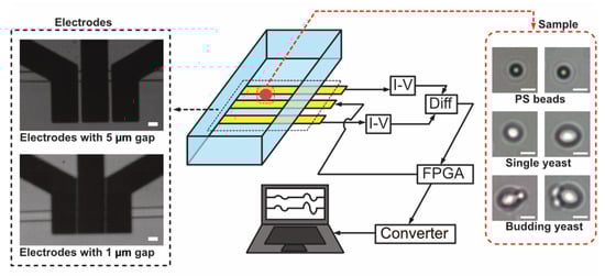 Demonstration of cell impedance detection in this research, sample conclude PS particles and yeast cells (scale bar: 5 µm); two kinds of electrodes have the gap of 5 µm and 1 µm (scale bar: 10 µm).