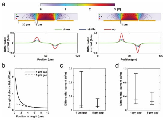 Figure 2b shows the strength of electric field at different depths at the center of the electrode span. Compared to 5 µm gap, a 1 µm gap can result in a greater gradient of voltage between the cathode and anode, resulting in a higher strength of electric filed. In other words, there was a concentration of current near the 1 µm electrode span. With distance from the channel bottom, this field strength gradually dims. Interestingly, at a distance of 4 µm from the channel bottom, both types of electrode spans showed similar field strengths. This phenomenon indicates that regardless of the electrode span, both designs show the same sensitivity to single objects beyond 4 µm from the channel bottom, while the 1 µm electrode span provides a greater sensitivity within 4 µm.