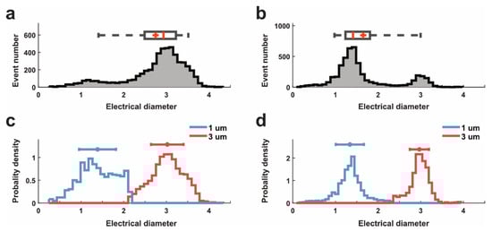 To verify the impact of electrode span on the impedance detection, experiments were first performed on the mixture suspension of 1 µm and 3 µm beads. The impedance signals of both beads were calibrated to the electrical diameter, as shown in Figure 3a,b. Figure 3a indicates that the 5 µm gap was applicable for the detection of 1 µm and 3 µm beads, while there was an overlay area between both regarding the electrical diameter. Besides, using a 5 µm electrode gap was more likely to fail to detect some 1 µm beads than using 1 m electrode gap; for example, in Figure 3b, there were many more 1 µm beads that appeared in the distribution plot when using 1 µm electrode gap compared to a 5 µm gap. In this work, the ratio of 1 µm and 3 µm beads in the suspension was around 9:1. When using a 1 µm gap, the measured ration was close to the real value, but it did not work with a 5 m gap. This phenomenon was attributed to most impedance pulses of 1 µm beads being covered by the noise, as their magnitudes were too small.