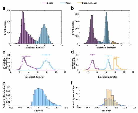Figure 4c,d show the distribution of the tilt index of impedance pulses when measuring with 5 µm and 1 µm electrode gap. The tilt index was employed to characterize the shape of single objects. In theoretic, objects with symmetric shapes, such as spheres, should have a tilt index of around zero; objects with unsymmetric shapes would have a nonzero tilt index. The tilt index increases with increasing the unsymmetric level of single objects. Typically, yeast cells did not exhibit a perfect symmetrical shape as beads, thus, their impedance pulses would be asymmetric in shape, resulting in a tilt index away from the zero. In Figure 4e, the tilt index of thousands of yeast cells was not evenly distributed around zero, which was attributed to their asymmetric shape. In Figure 4f, we took advantage of the difference in cell size between yeast and budding cells to isolate the tilt index of budding cells from others; the tilt index of yeast cells and budding yeast cells ranged from about −0.2 to 0.4 and −0.1 to 0.3, respectively. There is no clear difference between budding or normal yeast cells regarding the tilt index. We think that the tilt index might not be sensitive enough to monitor the morphology change induced by the cell budding in this work. However, it is worth mentioning that the electrode span of 1 µm still performed better for the morphology determination, as the distribution of tilt index was more centralized when using 1 µm electrode span rather than 5 µm span. The photos of yeast sample in experiments can be found in Figure S1 in Supplementary Materials, and the number of budding yeast cells is lower than normal yeast.