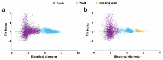 Figure 5 shows the scatter plot of electrical diameter vs. tilt index. In Figure 5a, the impedance detection with 5 µm electrode span resulted in a large overlayed area between the reference beads and yeast cells. In contrast, Figure 5b is the scatter plot of impedance signals measuring from electrodes with a 1 µm gap. Three groups of points could be clearly distinguished, including 3 µm reference beads, yeast cells, and budding yeast cells, respectively. Here, a cluster of cells were found to have a bigger volume than other cells and were identified as the budding cells; this is because the budding cells typically had bigger cell volume, resulting in bigger electrical diameter in impedance detection. Besides, the microscopic images also indicated the existence of buddying cells in the detection suspension (see Figure S1). As a result, it is easy to conclude that the sensitivity of impedance cytometry could be improved through narrowing the electrode span.