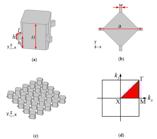 We proposed an SCC-PnC structure. As shown in Figure 1, the structural size of the phonon crystal designed in this paper includes the basic 3-D model of the phonon crystal, (Figure 1b) the top view of the unit structure, (Figure 1c) a partial structure of the phonon crystal, and (Figure 1d) the first Brillouin area of the phonon crystal. The lattice constant of the phonon crystal monocyte is a = 16 µm, the structure height of the square is H = 10 µm, the connecting plate h = 2 µm, the connecting plate w = 1 µm, the central height of the connecting plate is h1 = 5 µm, and the length is l = 2 µm.
