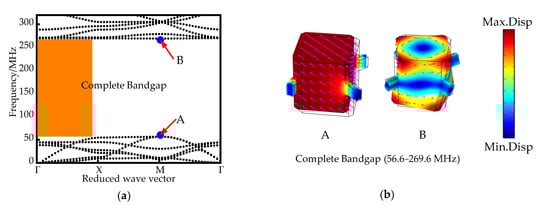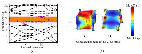 Parametric scanning of the first Brillouin region occurs along the Γ-X-M-Γ boundary in the first Brillouin region (IBZ). When h = 2 µm, the SCC-PnC dispersion curve is shown in Figure 2a, which has a complete band gap: 56.6–269.6 MHz. Figure 2b shows the mode shape diagram at the start-stop boundary of the SCC-PnC energy band. At point A at 56.6 Mhz, the inner mass is completely used as a vibrator, vibrating along a certain direction of the connecting plate; and at the cut-off frequency point B, it is the torsional vibration of the inner mass. When h = H = 10 mm, the structure at this time is a traditional phononic crystal (T-PnC), and its dispersion curve is shown in Figure 3a; it also has a complete band gap: 141.8–215.5 MHz. Figure 3b shows the mode shape diagram of the T-PnC band structure at the starting and ending frequencies. At this time, the mode shape of the initial frequency point C is the partial vibration of the internal mass block, and the vibration mass becomes smaller than that of point A. In addition, since the connecting plate acts as a spring at this time, its stiffness increases with h and becomes larger, thus resulting in a significant increase in the bandgap onset frequency.