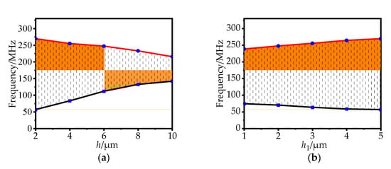 The phononic crystal’s structural change will affect the band gap’s range. By changing the height h of the connecting plate and the position h1 of the connecting plate, the change law of the starting band gap and the cut-off band gap is studied. As can be seen from parts in Figure 4a,b, keeping other parameters unchanged, with the increase of h, the starting frequency of the band gap increases rapidly, while the cut-off frequency of the band gap gradually decreases. With the increase of h1, the starting frequency of the band gap decreases slowly, while the cut-off frequency of the band gap increases slowly. Therefore, the width of the band gap gradually changes.