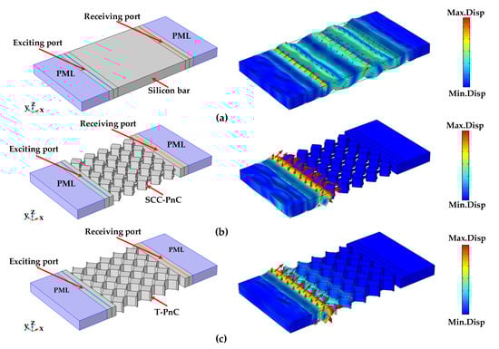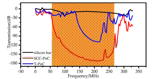 In Equation (3), and represent the upper and lower boundary frequencies of the band gap, respectively. High BG% represents a wider band gap, and higher BG% values indicate better performance of the phonon crystals. As can be seen from parts (a) and (b) of Figure 2, the width of SCC-PnC is about 130.6%, the central frequency (fc) of band gap is ( + )/2 is 163 MHz; the width of T-PnC is about 41.3%, and the central frequency is 178.65 MHz. The band gap width between the SCC-PnC and the different phonon crystal shapes designed here is compared over similar frequency ranges, as shown in Table 2.