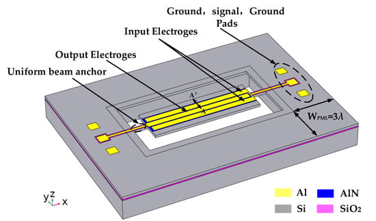 Figure 7 shows a 3-dimensional schematic diagram of the piezoelectric MEMS resonator. In this research, the resonator’s center electrode spacing (Wp) was set at 28.3 µm and designed as a fifth-order symmetric lamb-wave resonator with a resonant frequency of 149.66 MHz. For any given harmonic mode, the resonant frequency of the resonator is provided by the [,,]: