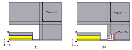 Only a quarter of the simulation model can be established in the simulation to reduce the calculation time, as shown in Figure 8a a traditional type piezoelectric MEMS resonator, and (Figure 8b) a piezoelectric MEMS resonator with a 4 × 7 SCC-PnC array plate. Because the overall structure of the resonator has symmetry, the simulation of the complete model can be equivalent by assigning “symmetrical” boundary conditions on the symmetry surface. Moreover, to avoid the influence of sound wave reflection on the simulation results, the width of the PML is generally set at three times the wavelength so that it can fully absorb the propagating sound waves.