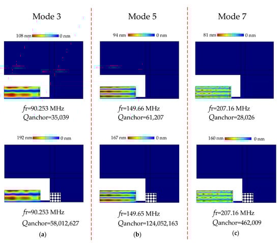 Schematic diagram of total displacement distribution of different MEMS resonators: Finite element simulation of vibration modes and quality factors for the (a) third (90.25 MHz, Mode 3), (b) fifth (149.66 MHz, Mode 5), and (c) seventh (207.16 MHz, Mode 7) overtone resonators of conventional resonators and SCC-PnC resonators.