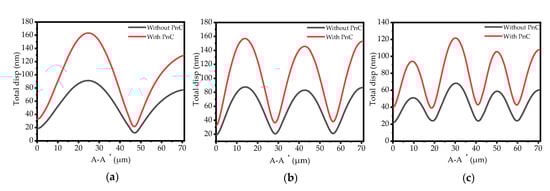 Illustration of the total displacement (μm) for the conventional resonator and the resonator with the SCC-PnC plate for the (a) 3rd, (b) 5th, and (c) 7th order width-extended modes on line A-A, respectively.