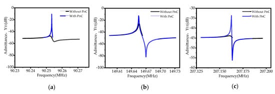 Admittance curves of the resonator under three successive overtones ((a) third−order over-tone, (b) fifth−order overtone, and (c) seventh−order overtone).