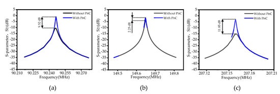 Figure 12 shows a comparison chart of the insertion loss (S21) curves of three successive overtones (third-order overtone, fifth-order overtone, and seventh-order overtone). Under three consecutive overtones, the insertion loss (IL) of the piezoelectric MEMS resonator is reduced from 10.54 dB, 4.18 dB, and 15.13 dB to 1.02 dB, 1.87 dB, and 3.28. Since the simulation is in the no-load process, the on-load quality factor (Ql) can be obtained by calculating the 3 dB bandwidth by Equation (9), and the unloaded quality factor (Qu) can be obtained according to Equation (10). We can see from the S21 curve obtained from the simulation that after the SCC-PnC array is integrated into the resonator, the equivalent density of the resonator changes, which will cause the resonant frequency to change. Still, the change is minimal, and the change of the resonant frequency can be controlled by adjusting the structure size. The above analysis and calculation show how the specific performance parameters of the traditional resonator and the SCC-PnC resonator under different overtones can be compared. The specific performance parameters are shown in Table 4.