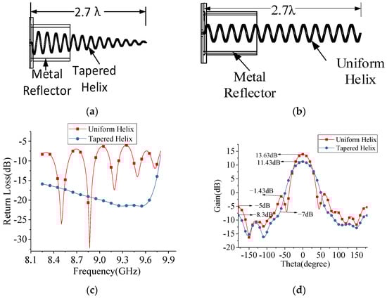 (a,b) Gives the schematic of tapered helix and uniform helix with metal reflector (c) Bandwidth comparison of tapered and uniform helix. (d) The gain and side lobe level comparison with tapered and uniform helix.