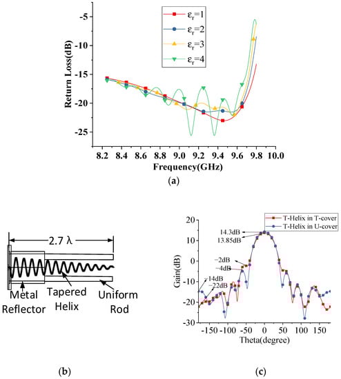 (a) Return loss of tapered helix antenna with covering of different dielectric constant (b) Schematic of Tapered-helix in Uniform cover (c) FBR with and without tapered dielectric cover.