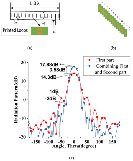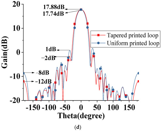 To show the effect of the second part on the radiation pattern of the first part, Figure 6c is helpful. It gives a comparison of the radiation patterns between the first part alone and the combination of the first and second parts. It can be seen that this part further improves 3.58 dB gain and a −3 dB side lobe level suppression. Figure 6d shows the radiation pattern comparison of tapered and uniform printed loops. It can be seen that printed tapered loops further suppressed −3dB side lobe levels, and 4 dB FBR is also improved.