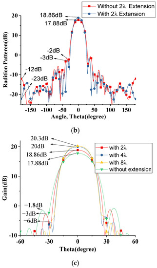 Figure 7b provides the radiation patterns comparison of the presented antenna with and without the rod extension. Noticeably, it is seen that this part further adds 1 dB gain along with 11 dB FBR. The relation of the gain with the length of this part is shown in Figure 7c. In increasing lengths of 2 λ, 4 λ, and 8 λ, the gain increases 0.98 dB, 1.14 dB, and 0.3 dB, respectively, and the side lobe levels are suppressed.