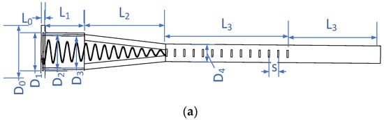 As shown in Figure 2, the first section of this part is a tapered helix inside a uniform hollow dielectric rod covered with 1 λ length of the circular metal waveguide. The rest of 1.7 λ of the first part is linearly tapered at the same rate as the helix inside. The helix has a uniform turn spacing of 0.21 λ, so there are a total of 13 turns for the whole length of 2.7 λ. The diameter of the helix turns is linearly tapered from 0.493 λ to 0.123 λ with the tapering cone angle of α ≈ 7.8°. As the tapered helix being primary feeding, the operating band and directivity can be predicted according to [19]. Additionally, the normalized phase velocity p of wave propagation along the helix can also be calculated based on (1) [19].