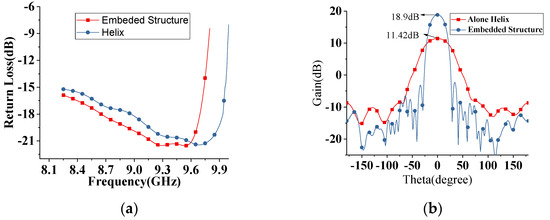 Figure 9a shows a comparison of the simulated return loss between the helix alone and the whole structure. It can be seen that the return losses are better than −15 dB in the working band of 8–9.7 GHz. Additionally, these two return losses are almost the same, which means that the operating band of the presented antenna is mainly determined by the primary feeding. Figure 9b provides the radiation patterns at 9.5 GHz, where it is found that the gain of the embedded structure is 7.43 dB more than the gain of a single helix and the side lobe level is also very low for the proposed design.