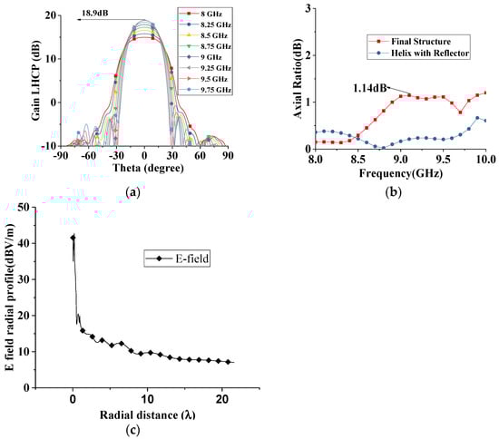 Figure 10a,b shows the radiation patterns and axial ratio at the zenith of the presented antenna for the whole working band. It can be found that the gain of the antenna is higher than 15 dB in the whole band, and a maximum gain of 18.9 dB is achieved at 9.7 GHz. The side lobe levels are below −20 dB in the whole band. Additionally, good polarization purity can be found; in Figure 10b, the axial ratio is below 1.14 dB in the whole band. The mathematical description of the amplitude of the field along the surface wave antenna is described in [12], and the electric field distribution of the proposed structure is shown in Figure 10c.