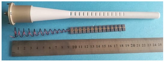 A prototype of the presented dielectric rod antenna was fabricated to verify the theoretical analysis, as shown in Figure 11. In the prototype, the helix was made of copper wire and placed into a Teflon hollow with a relative dielectric constant of 2.1. Then, the dielectric rod was fixed with aluminum reflectors. A 50 Ω SMA connector is used as the feed port, and the inner and outer conductors connect with the helix and the bottom reflector, respectively. The printed loops were fabricated on the F4B substrate with a thickness of 2 mm and a relative dielectric constant of 2.65. Finally, these printed loops were separated and inserted into the slots on the dielectric rod in series to construct the compact structure.