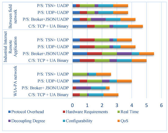Eckhardt et al. [22] evaluated the applicability of OPC UA pub/sub to industrial automation from the perspective of industrial control. They provided empirical evaluation metrics, which served as a significant reference for the feasibility analysis of the combined WIA-PA and OPC UA in the current paper. Since WIA-PA is a mature industrial wireless technology, the architectures and protocols of WIA-PA and OPC UA should be considered in their combination. Based on the evaluation metrics and the evaluation criteria proposed in [22], aiming to combine WIA-PA and OPC UA, we qualitatively analyze the feasibility scheme of combining WIA-PA and OPC UA from the six indicators of protocol overhead, hardware requirements, configurability, quality of service (QoS), decoupling degree, and real-time performance. The quantitative scoring rules for the indicators are as follows: 1 means fully satisfied, 0.5 means generally satisfied, 0.25 means unsatisfied but can be optimized, and 0 means not satisfied at all. The analysis results are shown in Figure 3.