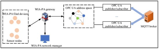 In an IWSN, the computing resources and energy of sensor devices are relatively limited, whereas those of the gateway are generally greater. Therefore, the use of a WIA-PA gateway as the coupling point between WIA-PA and OPC UA can maximize its abundant computing resources and energy. The system architecture of the WIA-PA/OPC UA joint pub/sub is illustrated in Figure 4.