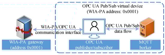 The device interconnection process is divided into two phases: WIA-PA gateway-based device interconnection and WIA-PA device address binding. In the former phase, the WIA-PA gateway performs resource discovery and communication transmission and realizes the connection between the OPC UA publisher/subscriber and the WIA-PA network. In the latter phase, the OPC UA publisher/subscriber and its corresponding broker middleware are virtualized as a virtual device in the WIA-PA application layer, which has a WIA-PA logical address and names the OPC UA pub/sub virtual device, as shown in Figure 7. The OPC UA pub/sub virtual device has a 16-bit WIA-PA short address. The WIA-PA field device can directly obtain the data source of the OPC UA publisher/subscriber through the short address.