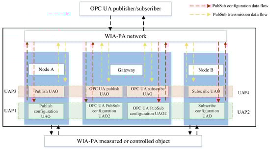 - Pub/sub configuration UAO in the field device. In the WIA-PA/OPC UA joint pub/sub configuration process, through the pub/sub configuration UAO, the field device registers the pub/sub operation parameters with the OPC UA pub/sub configuration UAO in the gateway and obtains the address of the OPC UA pub/sub message UAO in the gateway. The OPC UA pub/sub configuration UAO in the gateway and the pub/sub configuration UAO in the field device jointly realize the WIA-PA/OPC UA joint pub/sub configuration process.